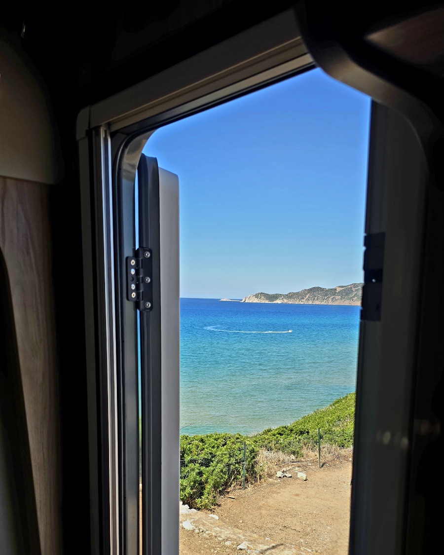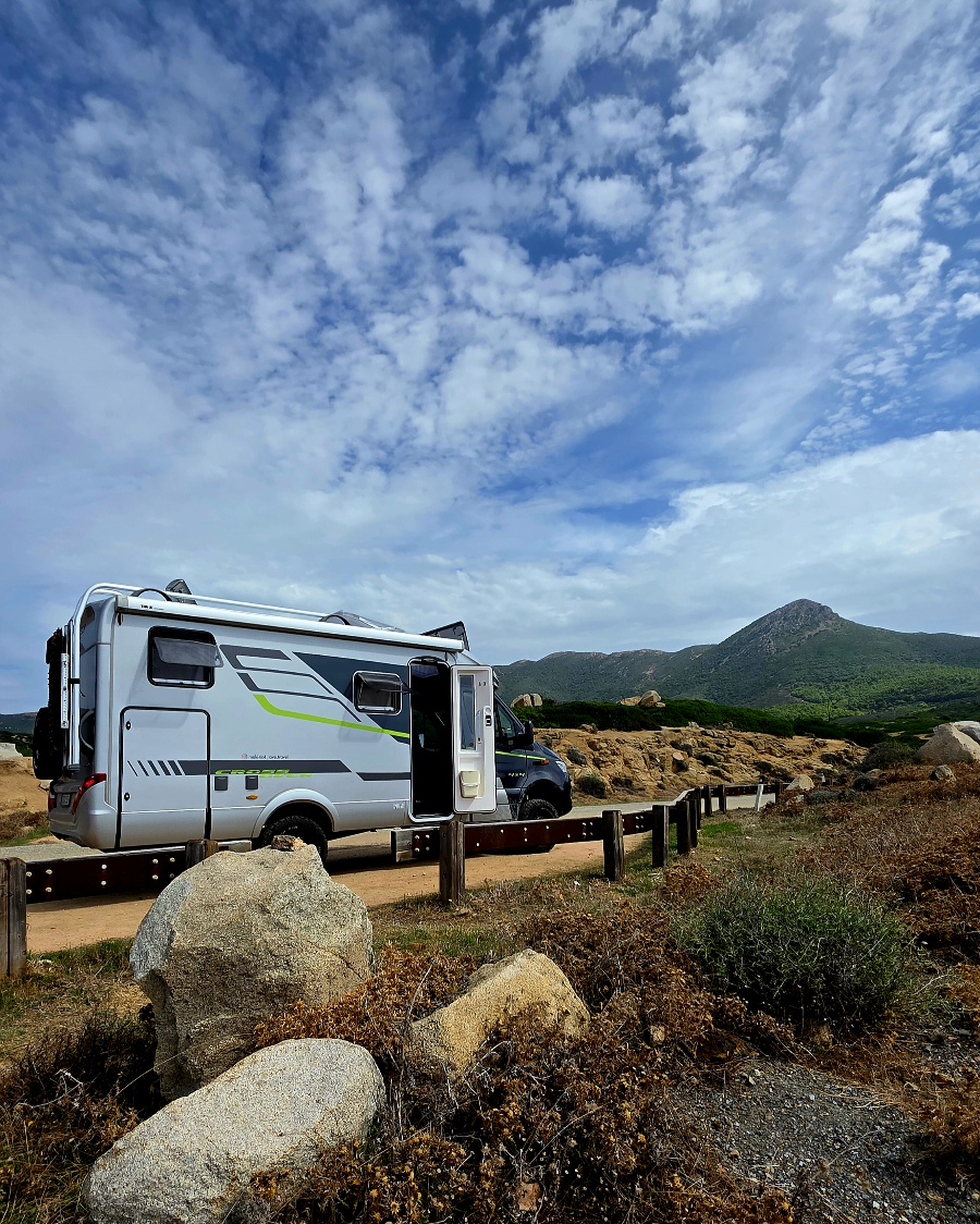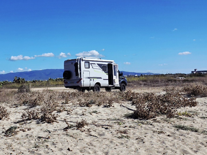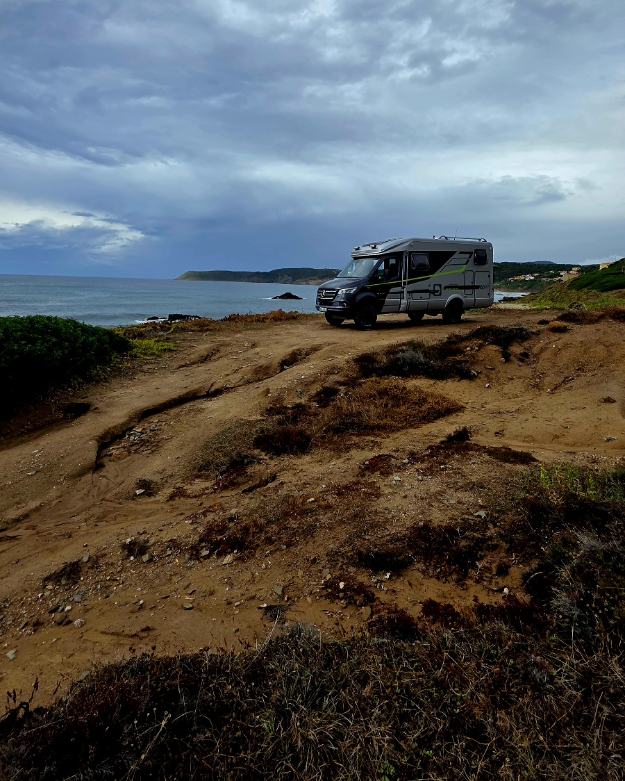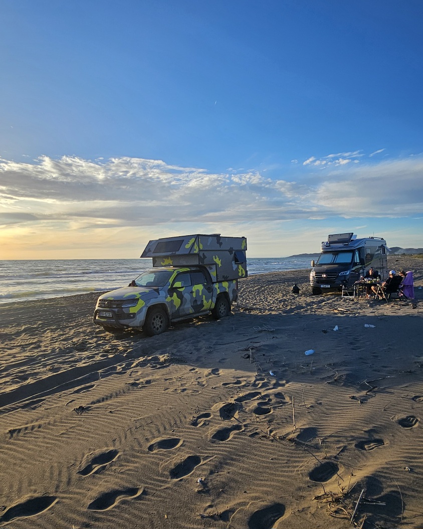 Der Parkplatz liegt direkt am Strand, offen, ruhig und bei unserer Ankunft komplett leer. Kein Verkehr, keine Häuser, kein Licht nur wir, der Camper und das Meer.