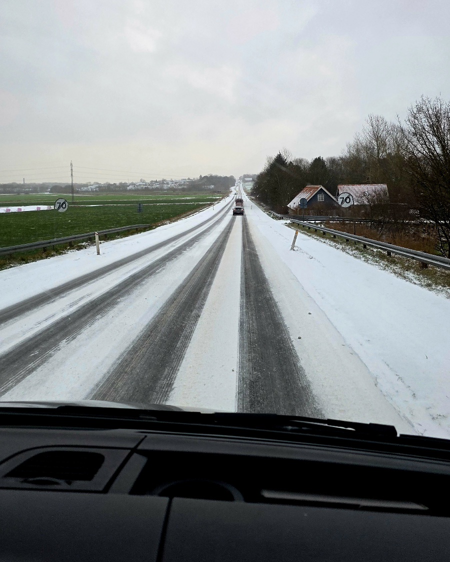 Gestartet sind wir noch bei bestem „Strandwetter“ 😄 Schon ein paar Kilometer später fing es an zu schneien, der Wind nahm zu und die Sicht wurde immer schlechter. Eigentlich kein guter Tag, um Strecke zu machen, aber wir wollten unbedingt nach Skagen.